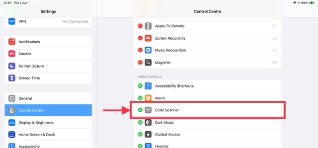 Settings > Control Centre - look for the Code Scanner function, tap the adjacent green “+” icon.
