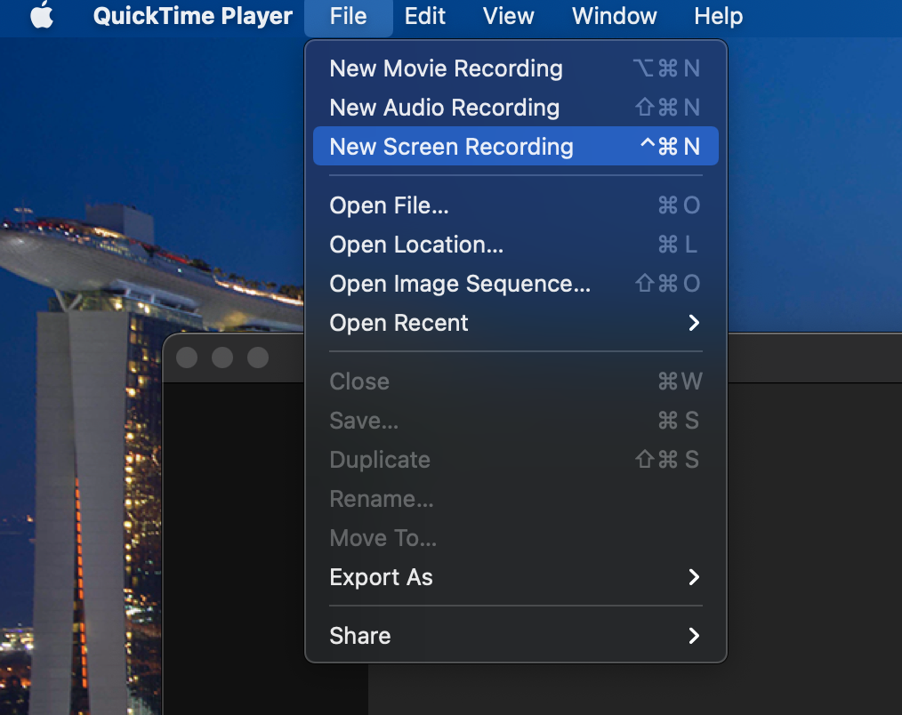 1) Open the QuickTime Player app. Under FILE, click ‘New Movie Recording’