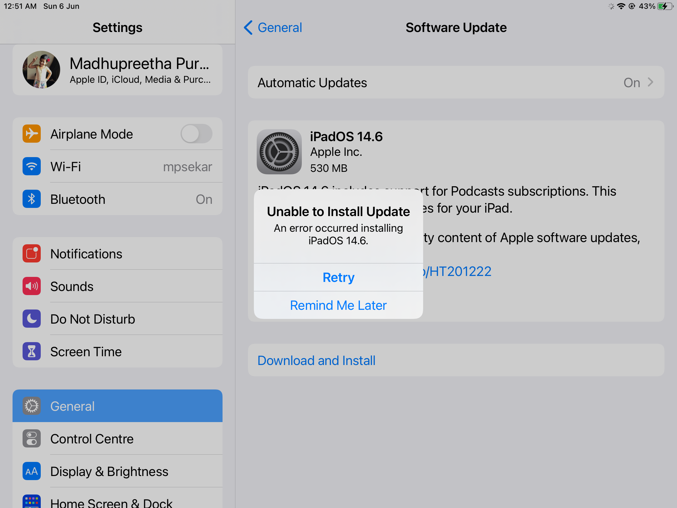 Unable to Install the latest software version iPadOS 14.6, iPad successful download the software but while trying to install the updates I am getting error, "unable to install update". Attached the error file as a screenshot.