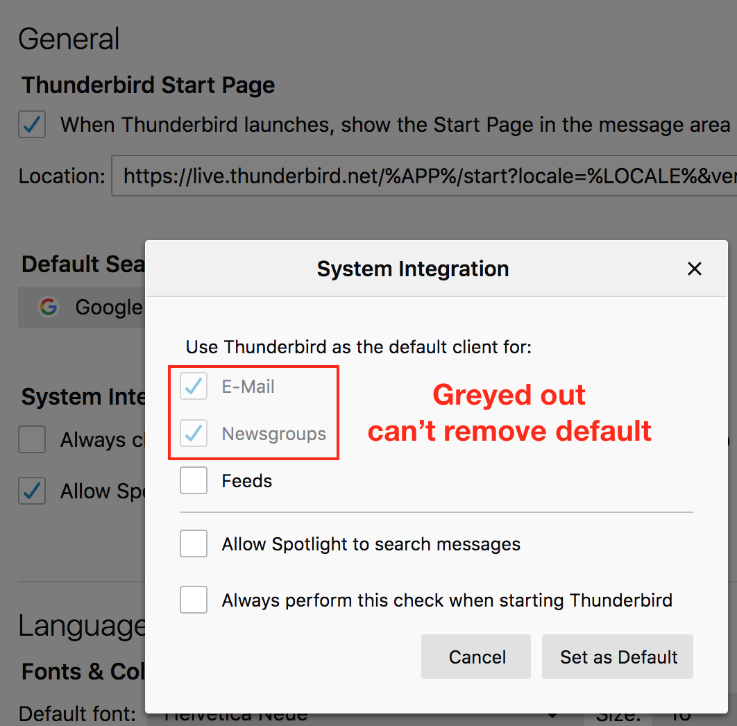 I'm migrating back to Mail from a bad T'bird experience, but the "default email reader" in Mail /prefs/general keeps flipping back to Thunderbird each time I set it to "Mail". And I can't see a way to remove it from the selection w/o uninstalling T'bird. Not ready to do that yet, and should be able to have both launchable with Mail as default.