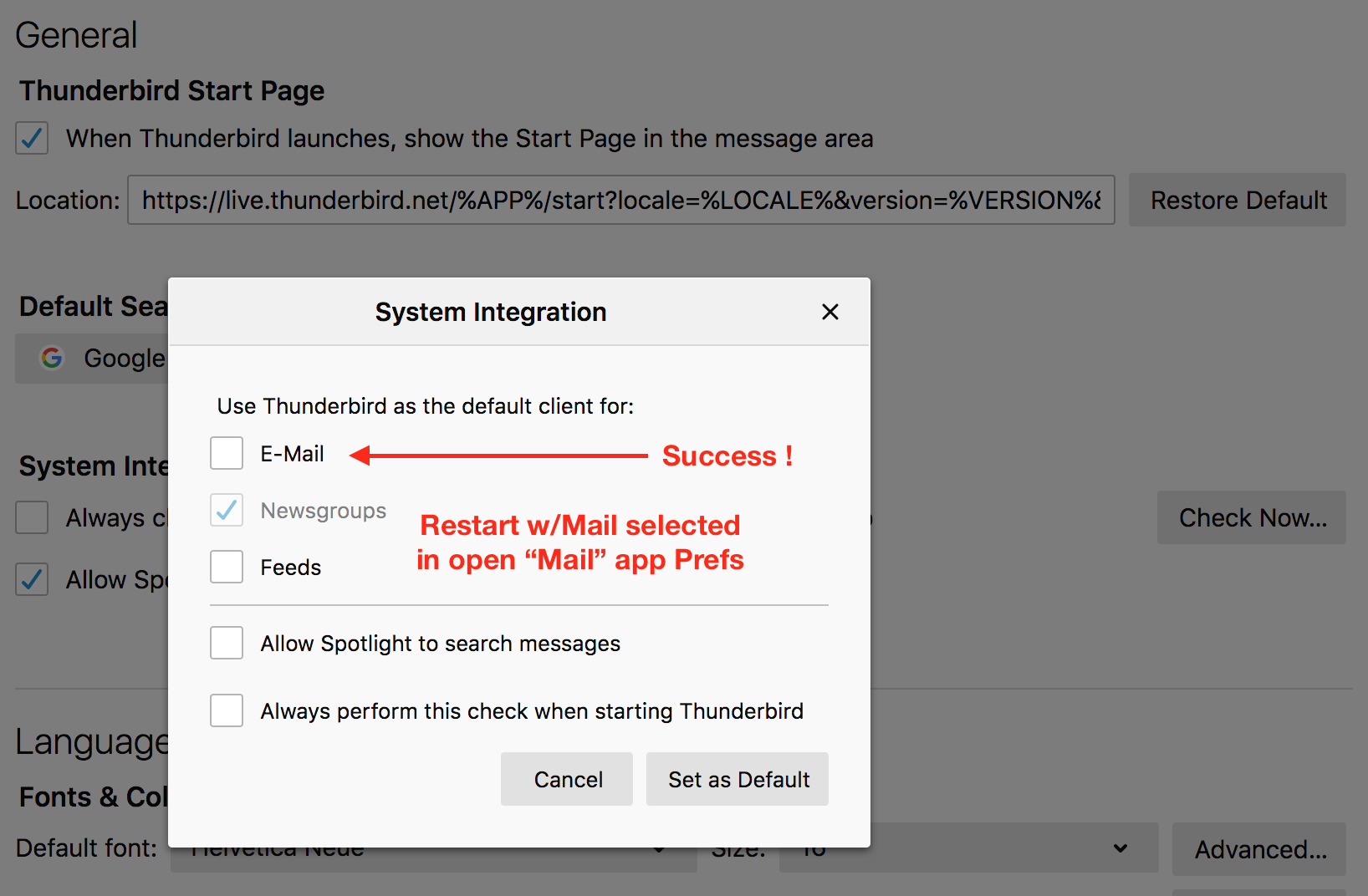 back to Thunderbird each time I set it to "Mail". . . . "