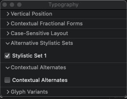 I would like to use an alternate stylistic set of a particular font as the font for my default profile in the Terminal application. I have gone into Settings > Profiles > Font > Change... and selected the icon in the upper left corner to modify the font features: