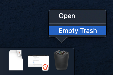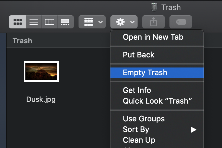 Or you can click on the trash icon to open it, then click on the gear icon, then click "Empty Trash". This is useful for checking what's in your trash before emptying it. There's also an "Empty" button near the top right corner of the window you could click instead.