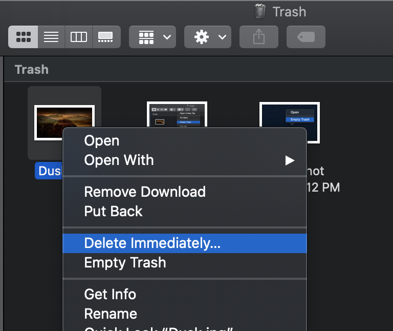 If you don't want to delete everything in the Trash, you can also delete individual or multiple files. Select the files you want to delete, do a 2 finger click, then choose "Delete Immediately". This will delete those files, but leave the rest in your Trash just in case you want to recover them later on.