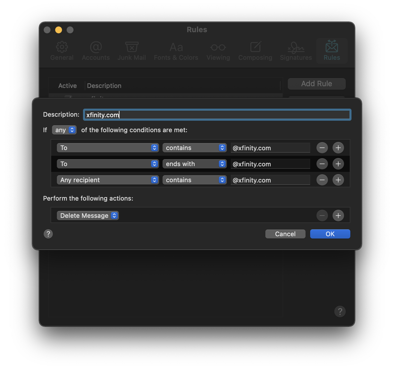 If you are receiving emails from an xfinity.com domain, then only the single rule should be to test if the From address contains @xfinity.com, not the To address. That should be sufficient.