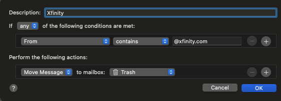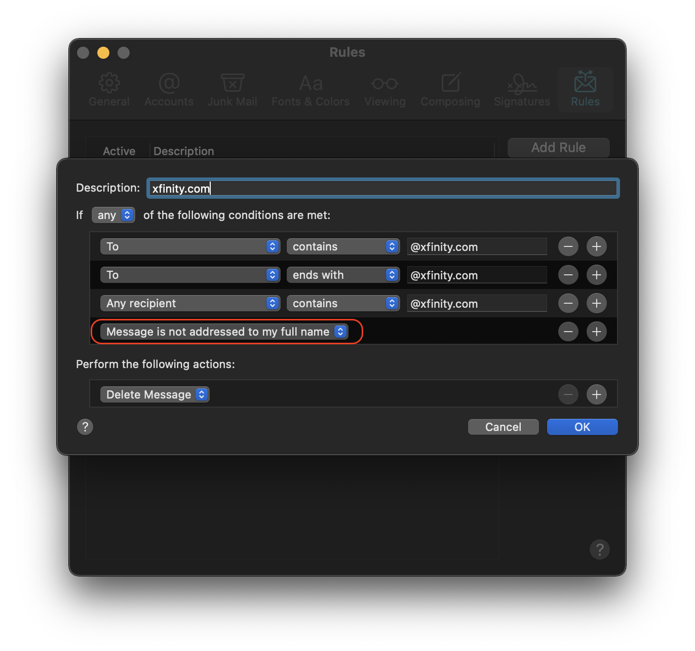 If you are receiving emails from an xfinity.com domain, then only the single rule should be to test if the From address contains @xfinity.com, not the To address. That should be sufficient.