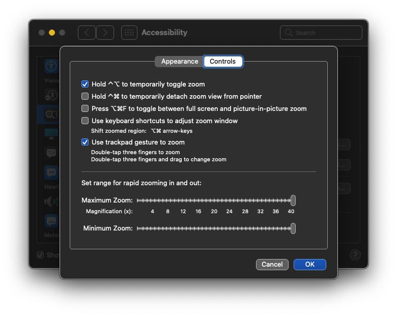 One other method to mention is the ability to temporarily toggle zoom on/off using option-control. This is actually the one I use most frequently but I didn't want to lump it in with the others since it's temporary. In the end I experience the same results as above. I also mention this separately because I have the ability to save the zoom level but this is only the case when zoom is already on. When I press option-control to temporarily toggle zoom off and then let go of the keys to toggle it back on it returns to that same zoom level.
