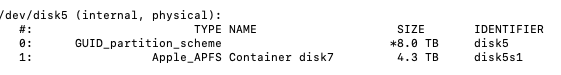 I have an 8 TB disk in my Mac. I had 2 APFS containers on it (disk7 and disk8). After deleting APFS container disk8, I get this: