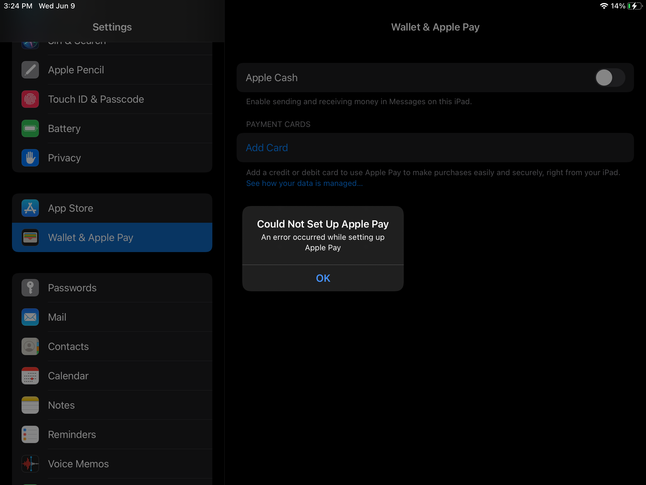 I could not set up Apple Pay on my IPad. It was saying a message.