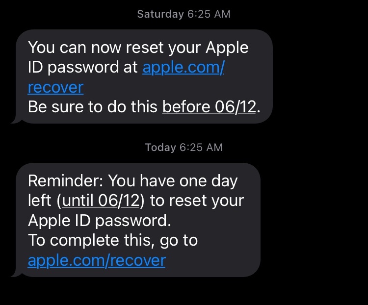 I just got a text from apple saying “Reminder: You have one day left (until 06/12) to reset your Apple ID password.