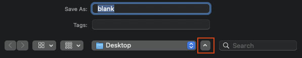 Save and Export panels have a minimalist, and expanded view based on the direction of the arrow toggle in the indicated red box. Pointing up, it is an expanded view, which provides more flexibility in your save location selection.