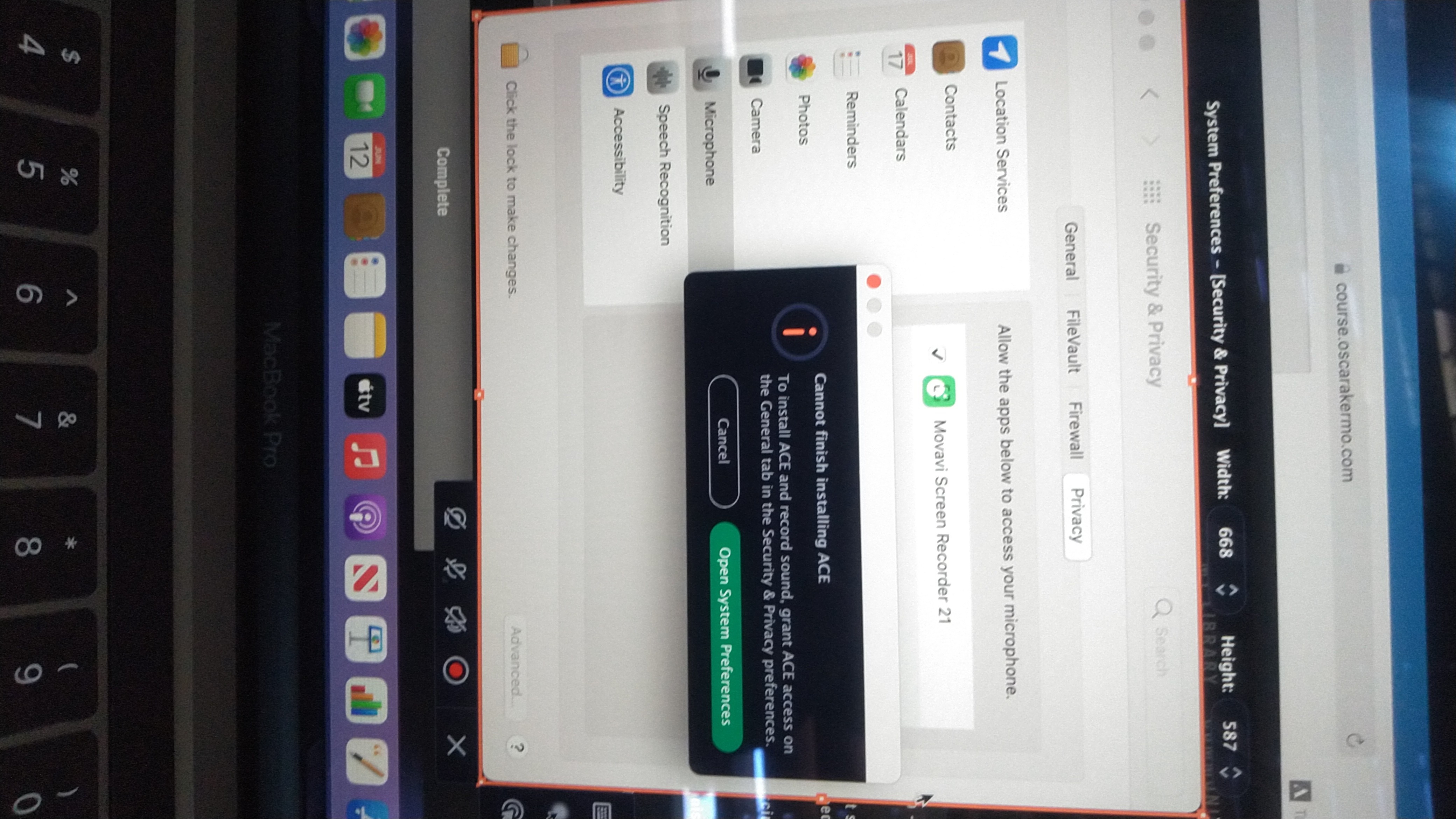 I cannot record audio on my movavi screen recorder.... When I click the icon to record audio a promt comes up saying (cannot finish installing ACE to install ACE and record sound, grant ACE access on the general tab in the Security and privacy preferences.)