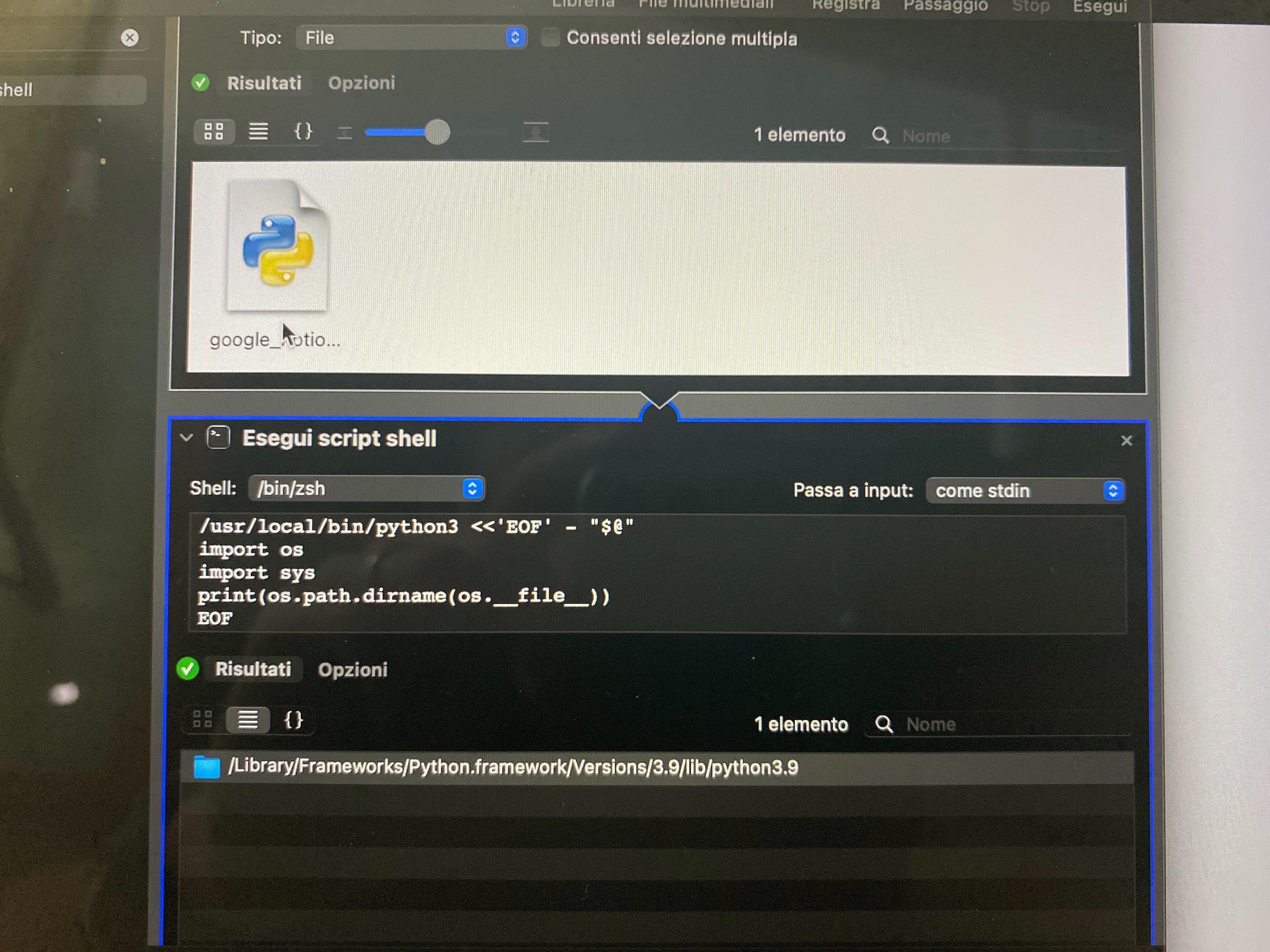 If I run exactly the same code in brackets using Automator shell function or Apple Script, they give me an error of a Python module not installed (but it's installed, I'm sure it is)