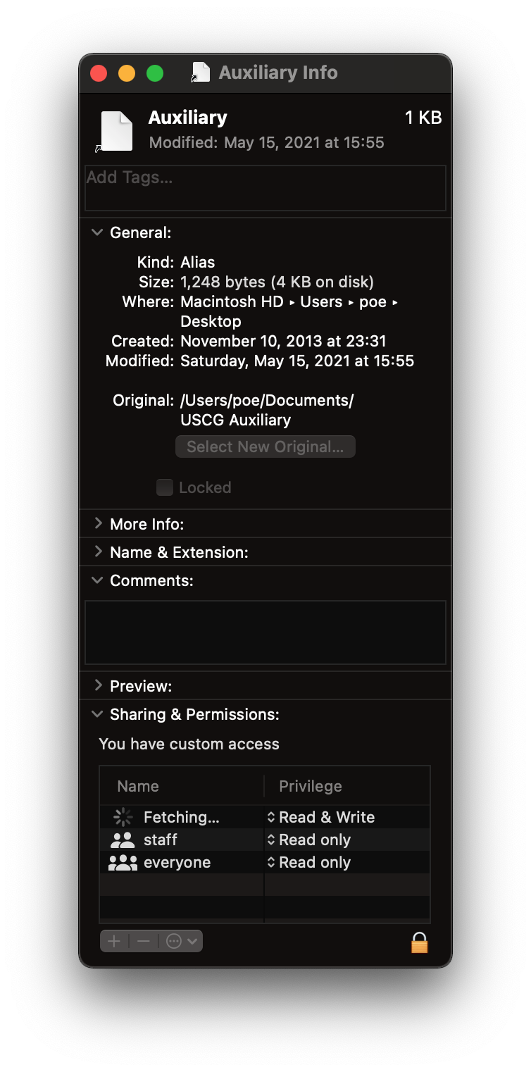 If OTOH, the alias(es) refer to a local or even the startup drive file location itself they usually cannot be reconnected (in Get Info) on the alias the "Select New Original" there is grayed out! Have had this issue in one form or another with the same set of files (originals haven't moved) ever since Big Sur. When that disconnected alias is on a local source, it often cannot be reconnected through the Finder anyway and Get Info shows it, thusly. remaking the alias in place without moving the original restores the alias, until a future restart again corrupt them. Rinse and repeat.