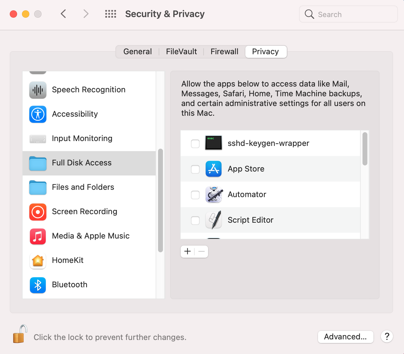 The side effect to this behaviour is that some apps like sshd-kegyen-wrapper or Terminal that may not actually need Full Disk Access will likely show up in the list. All of these are legacy tools that have lots of old code that was never, and will never, be modified for modern security concerns.