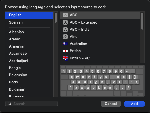 > System Preferences, click Keyboard, then click Input Sources. - Click the Add button