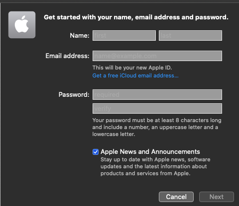 Next window appears fill up first and last name again click on get a free iCloud email address .