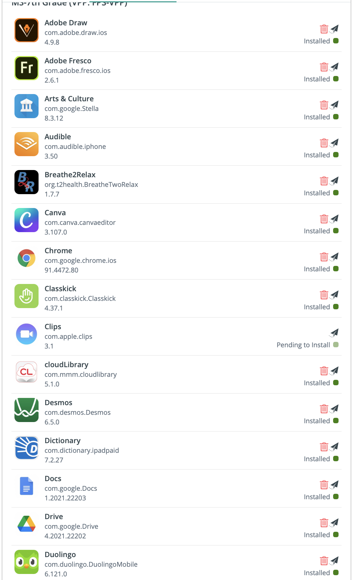 Is anyone else having an issue with Mosyle MDM system that Apple Apps (Garage Band, iMovie, or Clips) is not installing on the iPad. All other apps are installed on the iPad. We have updated the iOS and then wiped the iPad and it is doing a clean install of the apps. The iPads are hard wired to the network and is not using wifi to install Apps. All it says that it is pending install