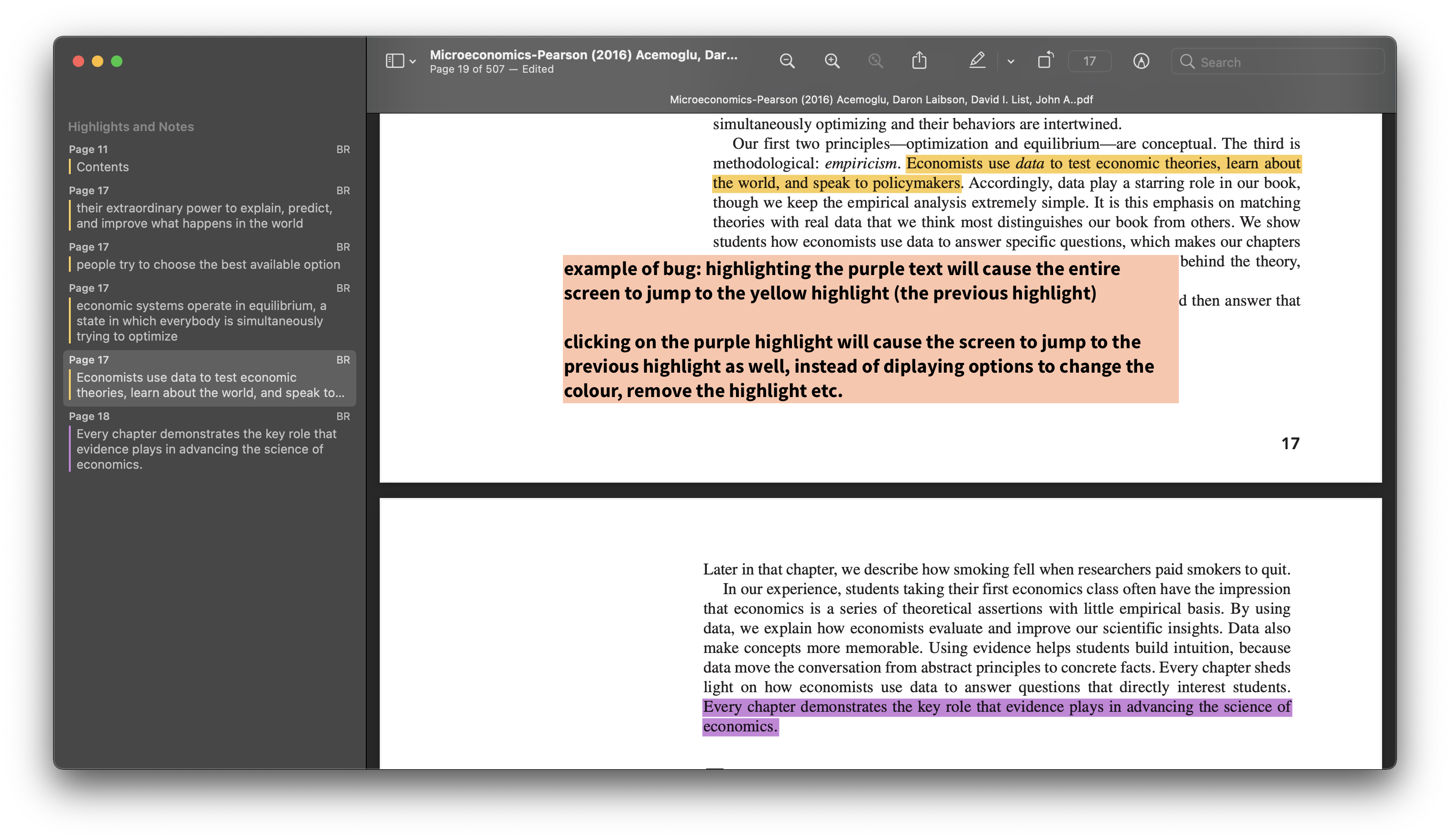 Preview has been buggy for me for the past year or two when it comes to Highlights and Notes. When I highlight some text in a pdf, after highlighting, Preview will jump up to the nearest Highlights & Notes content (an other bit of highlighted text, or a note). This is particularly frustrating, as every time I highlight some text as I read along, I have to scroll back down to where I was reading anytime I want to highlight something.