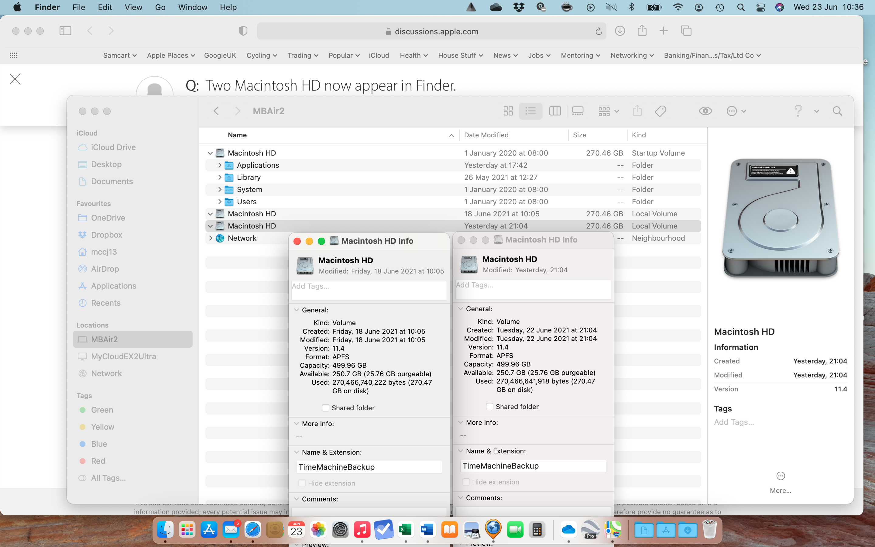 I now have two Macintosh HD appearing in Finder. One was created 01 January 2020 and the second one was created on 18 June 2021. The one fro Jan 2020 contains Applications, Library, System, users. The Name and Extension shows as Macintosh HD. However the one that was created in June 2021, contains nothing that I can see in Finder, although if I Get Info, it does show that some of it is in use (exactly the same as in the other one. However the June 2021 created one in the Name and Extensions box says TimeMachineBackup. Can anyone tell me why this has happened and if it is using up my hard drive memory or what? Thanks.