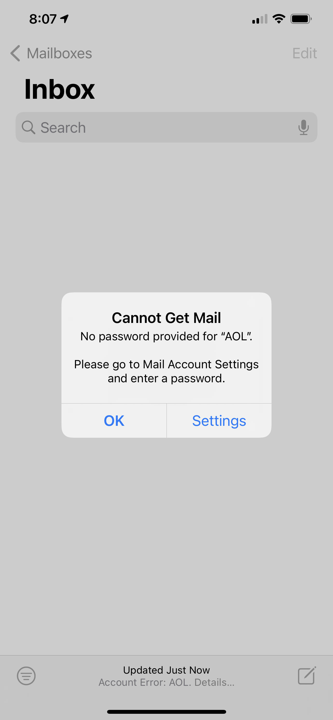 All of a sudden I get an error with my email stating invalid password both on my phone and iPad. Nothing changed. It worked last night and today nothing. I can access my AOL mail through my desktop. It’s really frustrating!!!