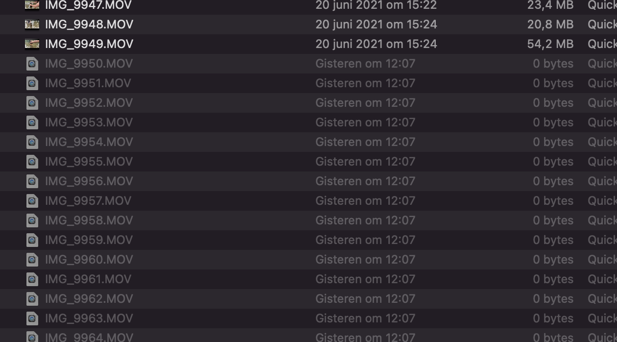 I see files up to IMG_9949.MOV that seem fine, and all starting from 9950 are zero bytes.