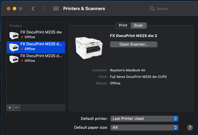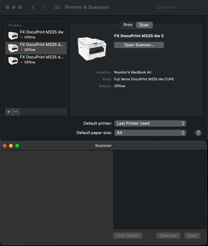 You should not install the Fuji Xerox printer/scanner drivers when using AirPrint as it is supposed to provide that functionality without the vendor drivers whose installation may compromise the AirPrint capability. AirPrint should also allow you to detect and scan using Apple's included Image Capture or Preview utilities.