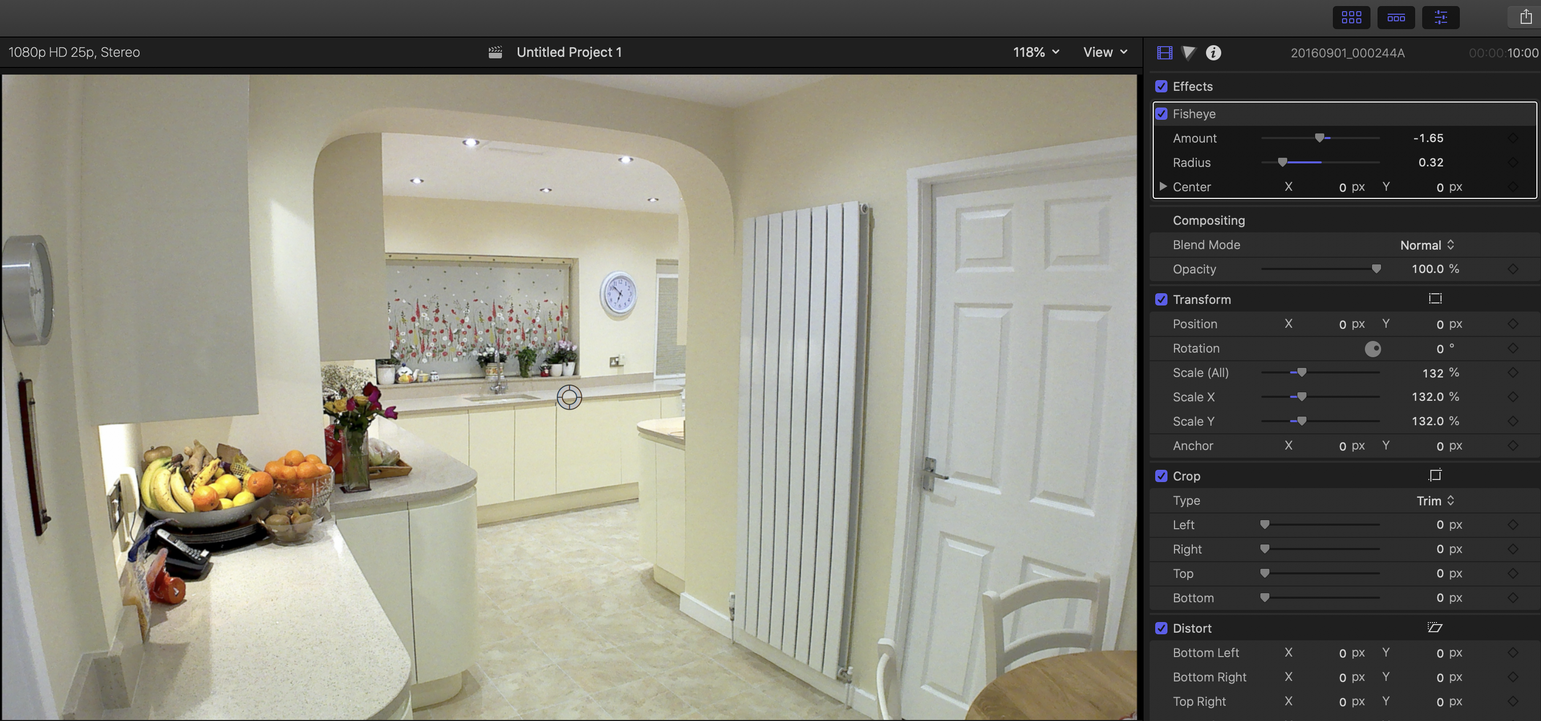 This is the exact formula I used for my Fisheye Redux effect that I used above. However, I also used my Lens Distortion Fix effect to straighten out the verticals. Although I believe you can do the same with the Transform > Distort function in FCPX, my effect works just a little bit differently, so YMMV.
