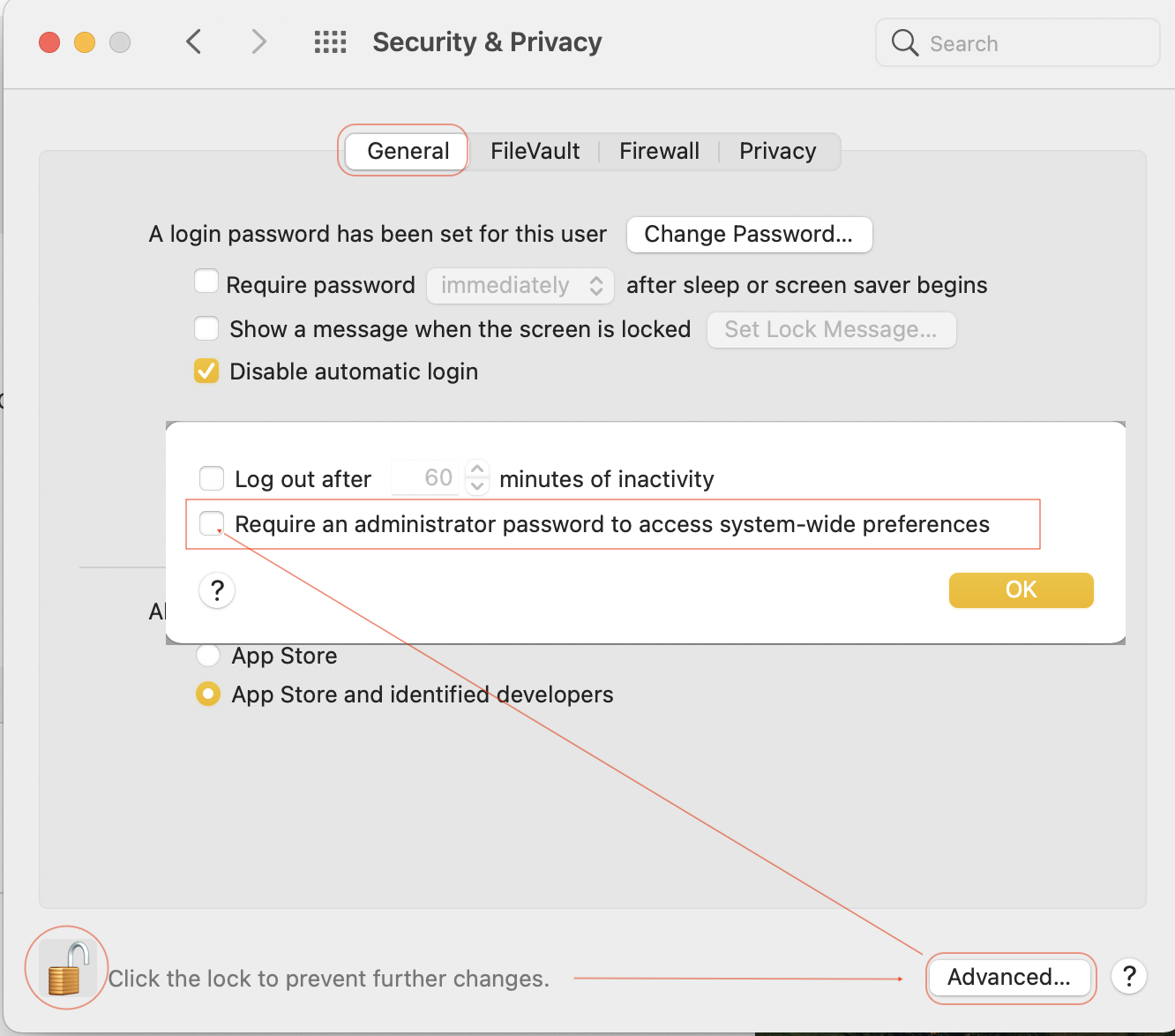 Change Security & Privacy General preferences on Mac ...