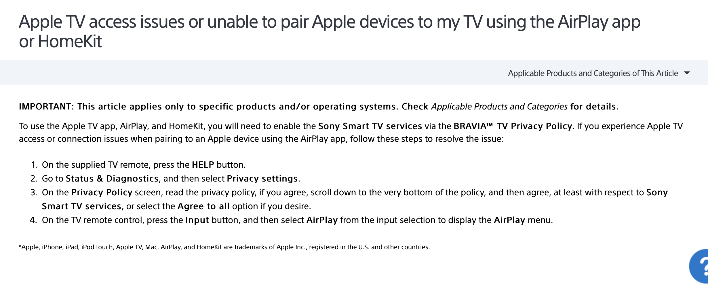 To use the Apple TV app, AirPlay, and HomeKit, you will need to enable the Sony Smart TV services by accepting the BRAVIA TV Privacy Policy. If you experience Apple TV access or connection issues when pairing to an Apple device using the AirPlay app, follow these steps:
