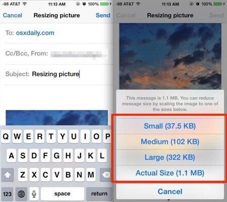 On my phone When I Get Ready To Send The Image on the top Right Hand Corner I have a Small Blue Circle with a White Arrow Pointing Upward indicating that I am ready to send the email. With these procedures I was able to have the settings to reduce image size.