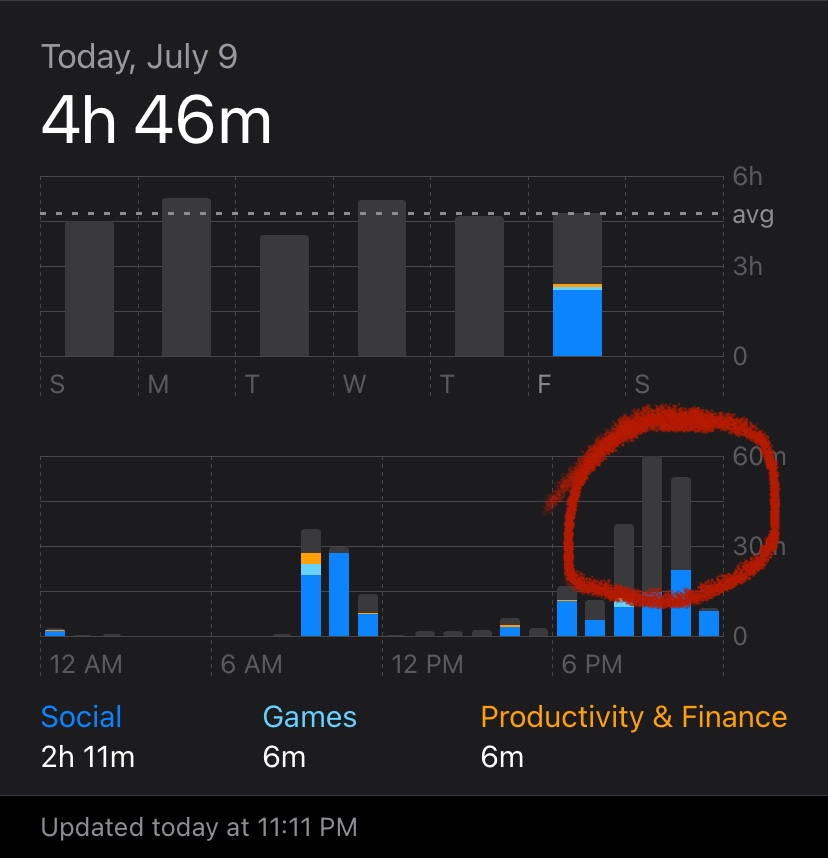 While Facetime is being used the screentime is showing that the phone is in use (grey area on the screenshot provided previously), but the actual app time was only showing 6 seconds used, instead of about 1 hour.