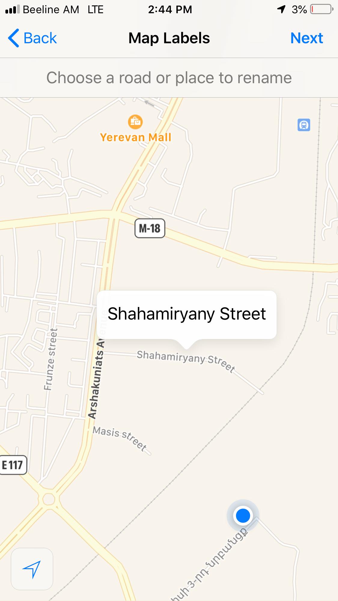 The Shahamiryany street in Yerevan's Shengavit administrative district, the Republic of Armenia, was renamed after Hrant Vardanyan on June 22, 2021. Please, advice! How is possible to rename the street on the Apple map. The postal code is 0061. I've tried to rename the street on the Apple via map settings / Report an Issue/Map Labels/ Rename roads category but unfortunately haven't got any feedback yet. I just send you screenshots of the street and the Yerevan City Council's decision to rename Shahamiryany Street in Yerevan’s Shengavit administrative district after Honored Worker of the Armenian Economy, benefactor Hrant Vardanyan.