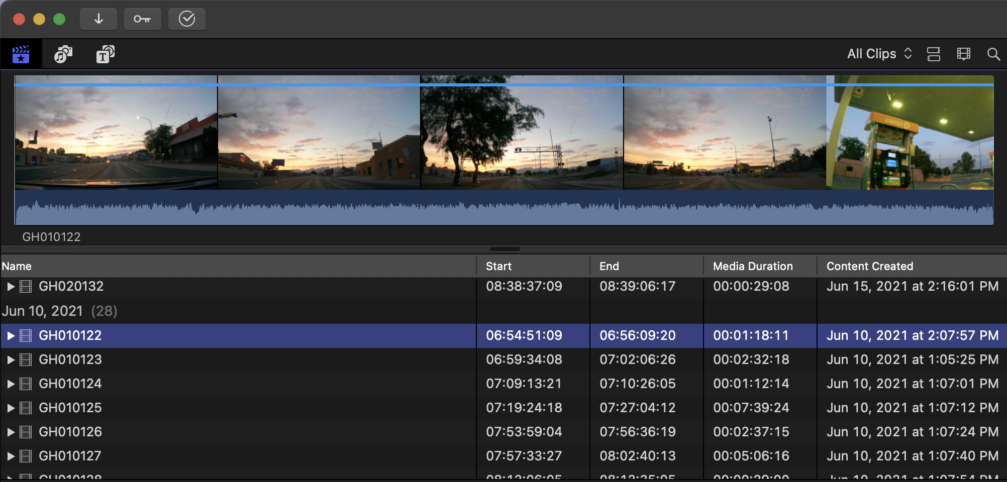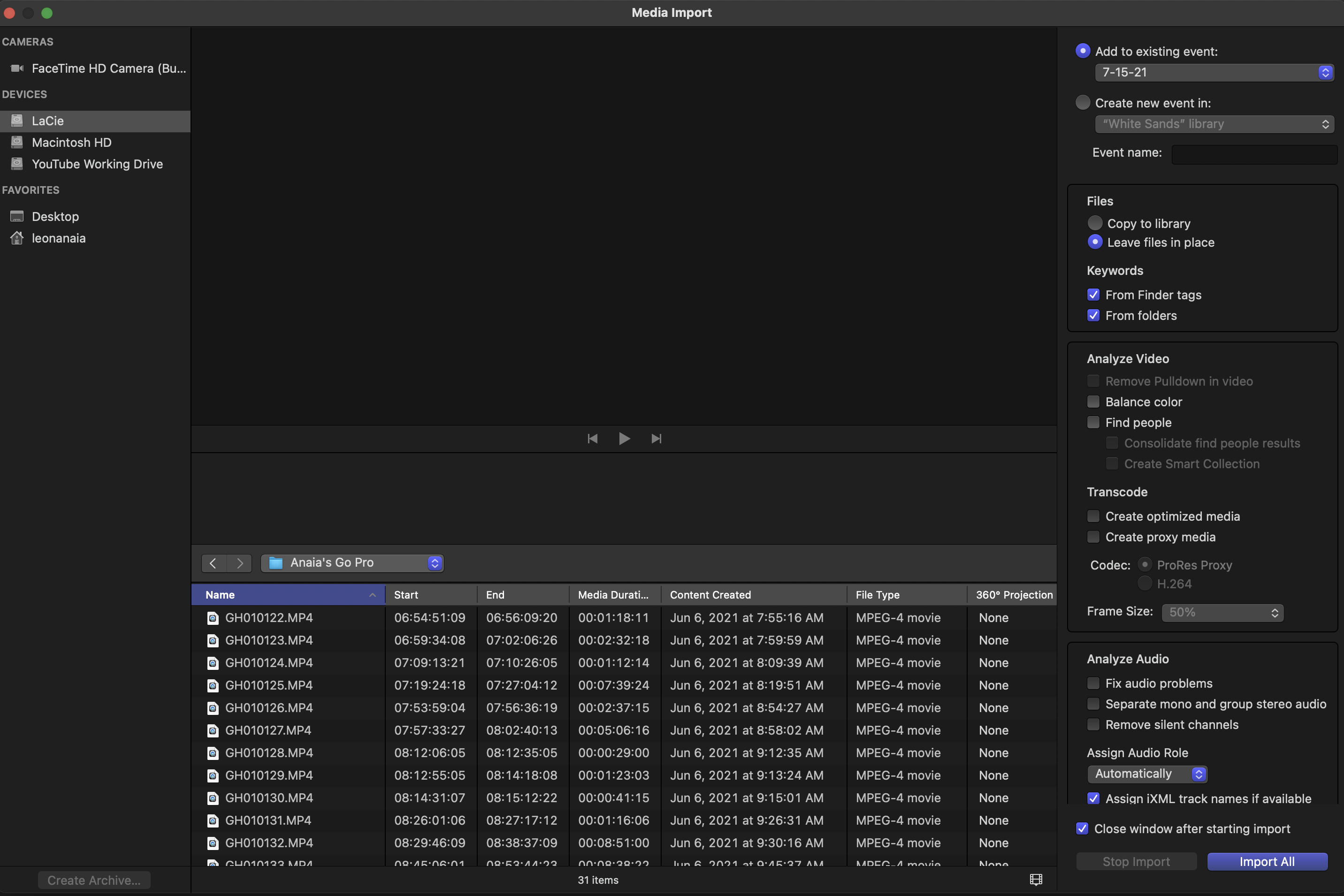 When I go to import my files into my events library in Final Cut Pro, the content created column shows the correct date and time for my video files which is June 06, 2021.