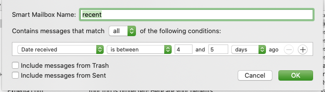 A second Smart Mailbox, whose filter is only a narrow receipt date, shows an unread message count of 2, but no unread messages.