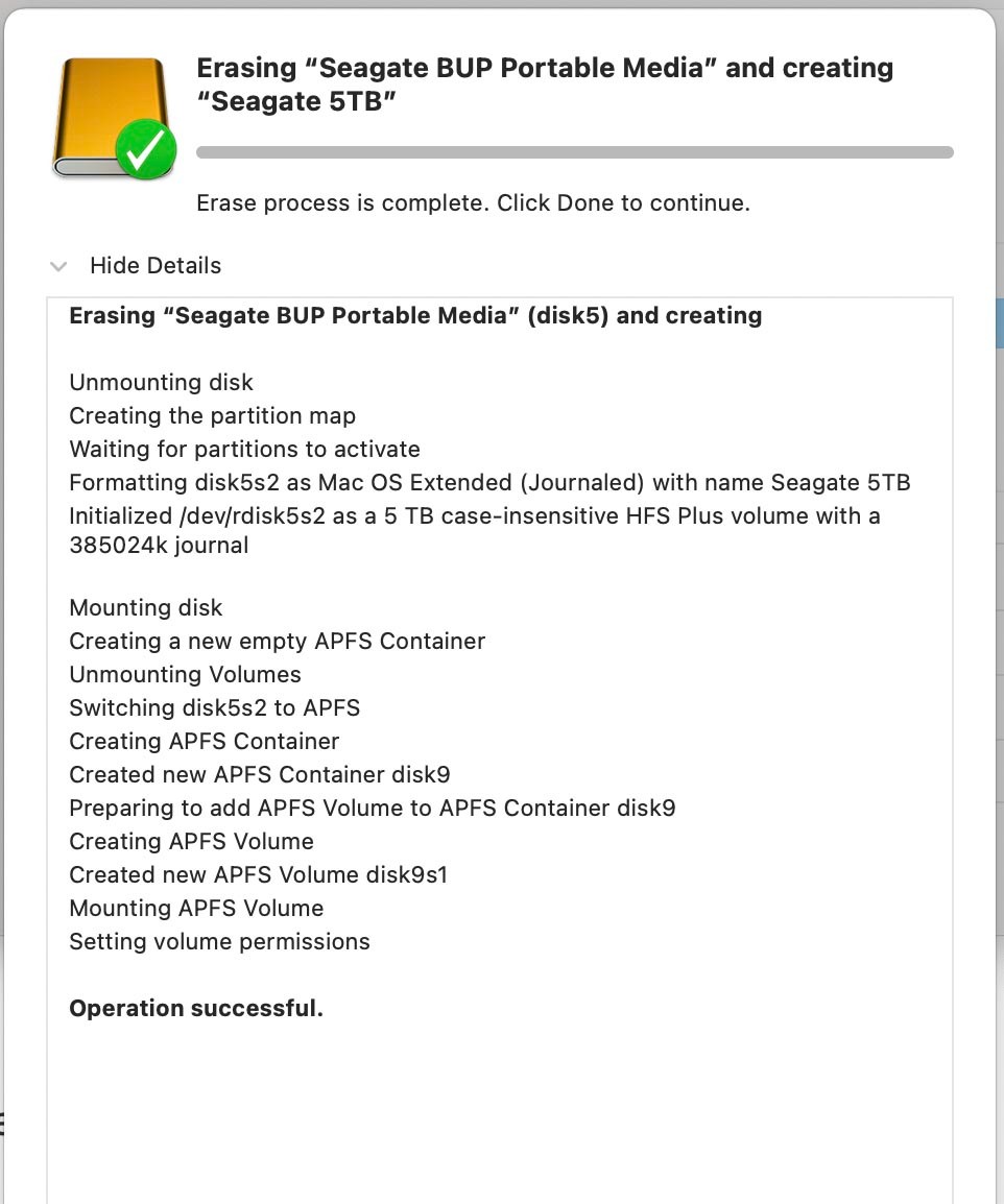I'm backed up now to the reformatted Seagate external drive. (Took 15 hours.) I read Muguy's links and proceeded accordingly.