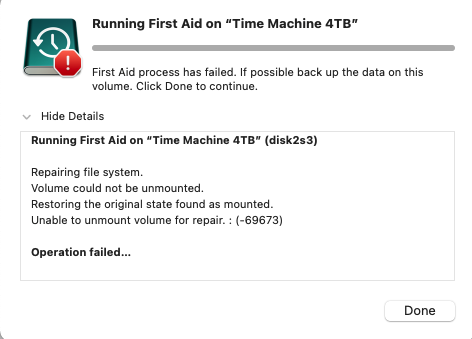 I am trying to run First Aid to recover 4TB of drive space from a previous Time Machine backup. the error message states that it will not unmount