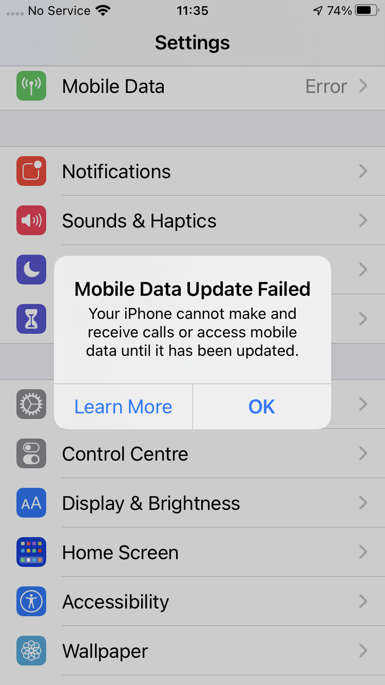 "Mobile data update failed: i am getting this message mobile data update failed and I am not able to make recieve calls and access mobile data until it has been updated . Not able to figure out how can I update"