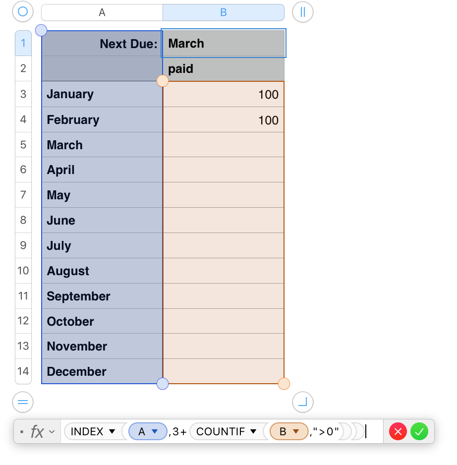 Specifying the cell range for INDEX as A1:A14 Will work, as will using the same style to specify the cell range to be counted in column B, as can be seen in the example below: