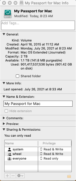 I have an external WD drive. When I try to add or delete a file or folder to that drive it asks for my Apple password. How do I stop the password requirement? I am the only user of both my MacBook Air and the external drive.