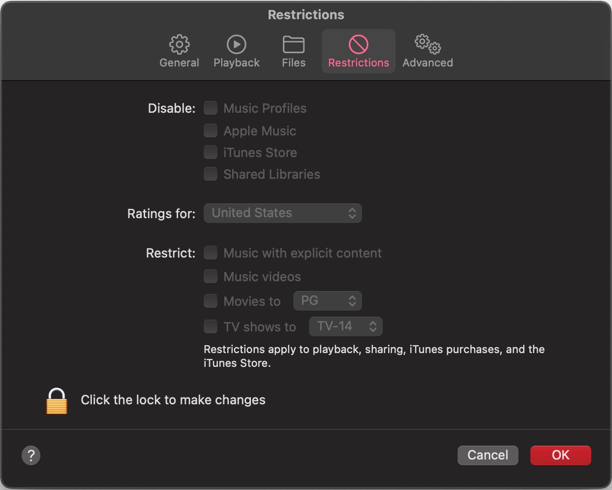 The solution for me was to launch Music and then click Music - Preferences - Restrictions. There I had