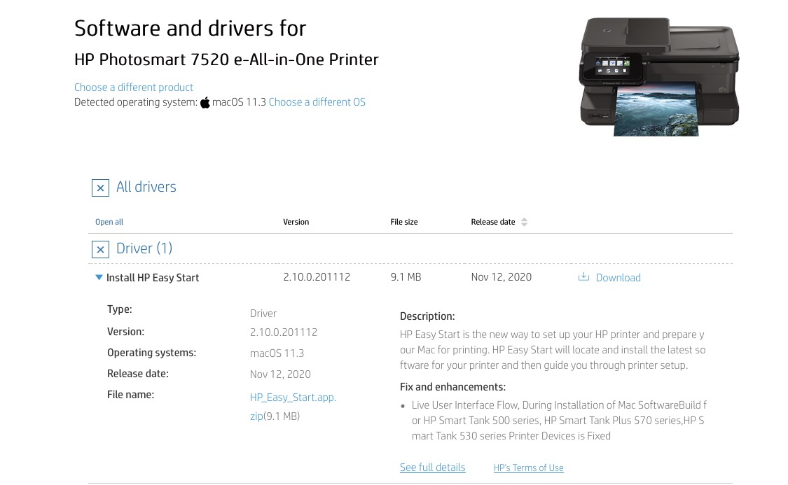 An HP Photosmart 7520 e-All-in-One Printer is listed in About AirPrint - Apple Support as a printer supporting the driverless AirPrint technology. An AirPrint-enabled model is compatible with macOS, and does not require the installation of drivers if the printer and the computer are connected to the same network (Wi-Fi router).