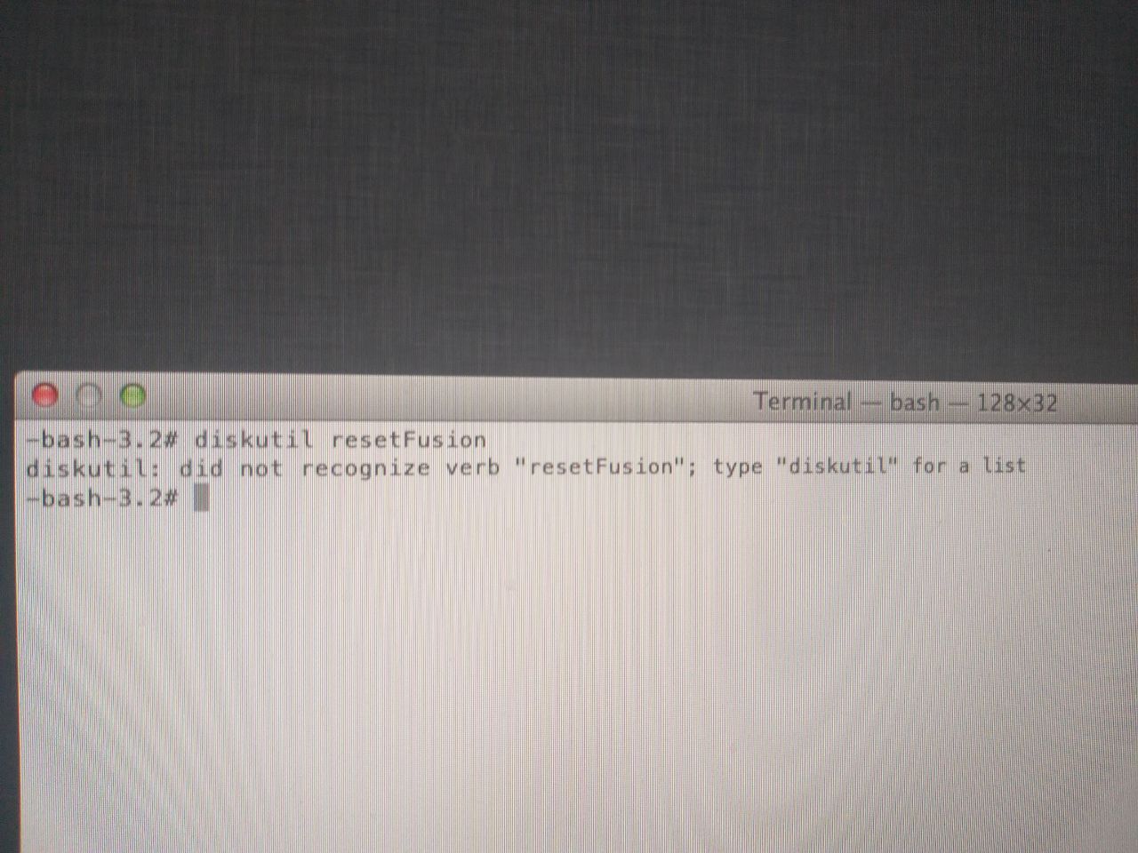 Not sure if this will help, but run the diskutil resetfusion command again, only this time type YES and hit enter. (not Y-enter).