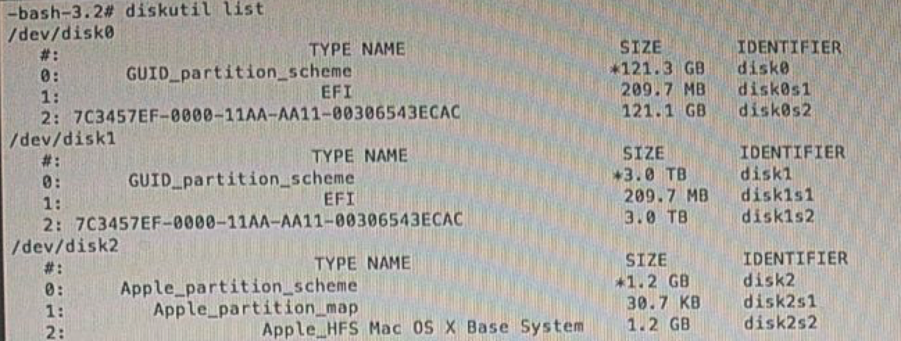 which rteturned a variety of files including Dev/disk0 (120GB) and Dev/disk1 (3 TB) then various others much smaller in size
