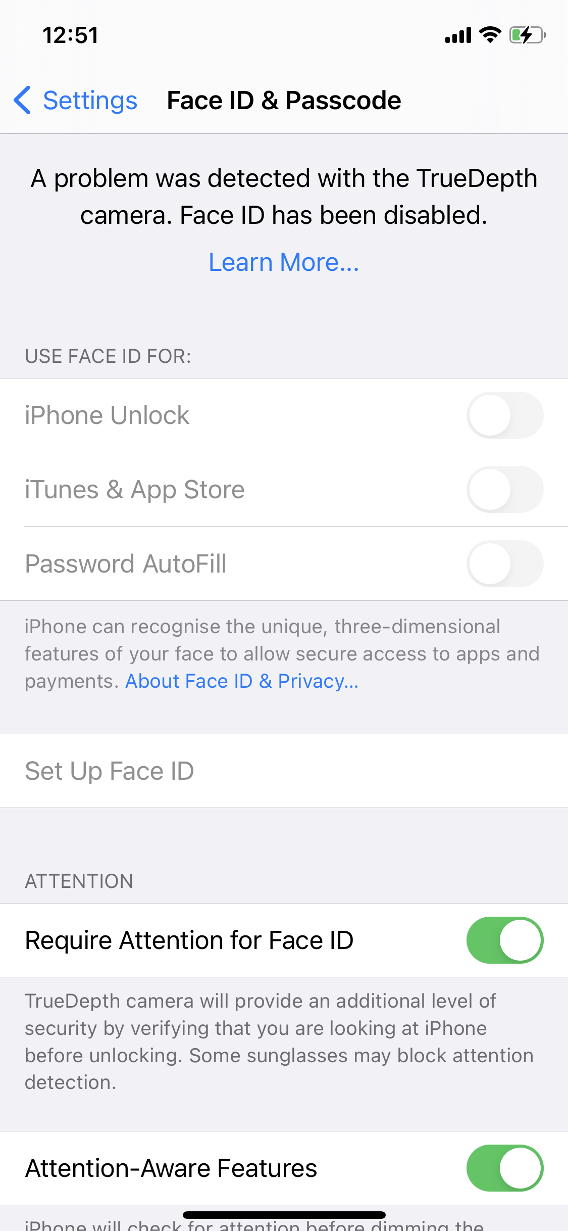 A problem was detected with the TrueDepth camera.Face ID has been disabled