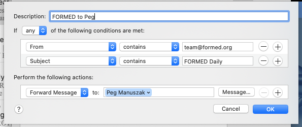 Trying to forward an email from my account ***@comcast.net to my wife's ***@comcast.net by setting up a Rule in Mail. It is not working. I can send an email to Trash, but not forward.