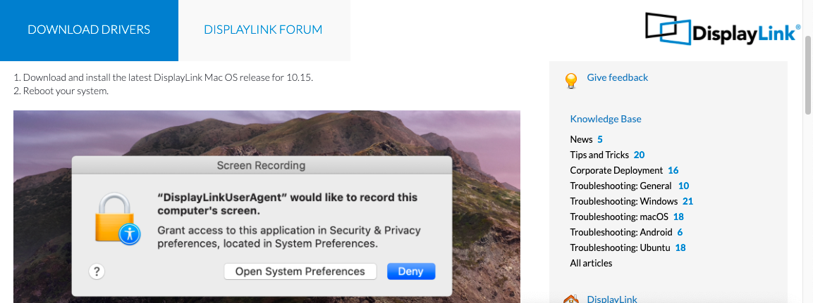 The second step is that the driver is downloaded as DisplayLink Manager and it requires opening system preferences, opening security and privacy and allowing DisplayLink Manager "to record (???) your screen."