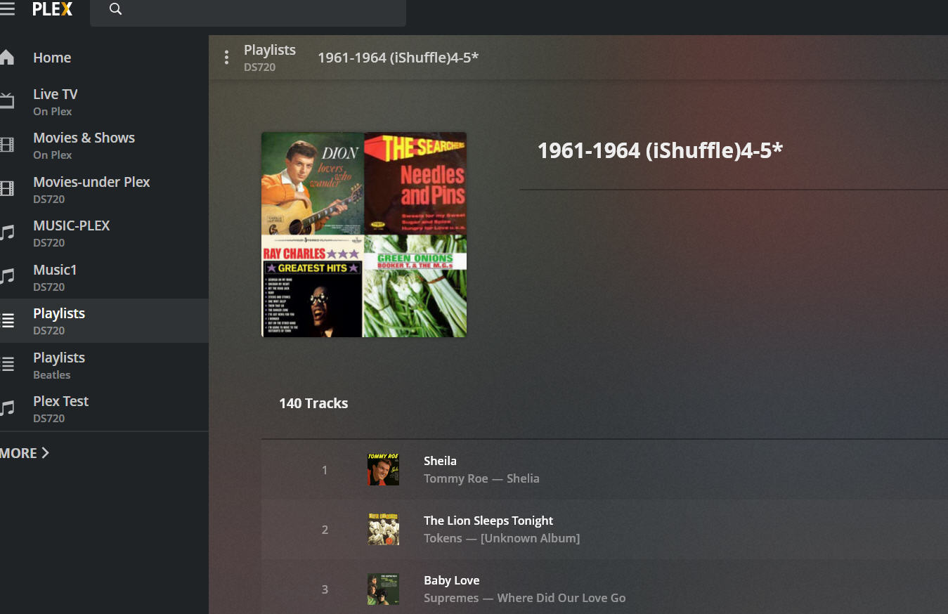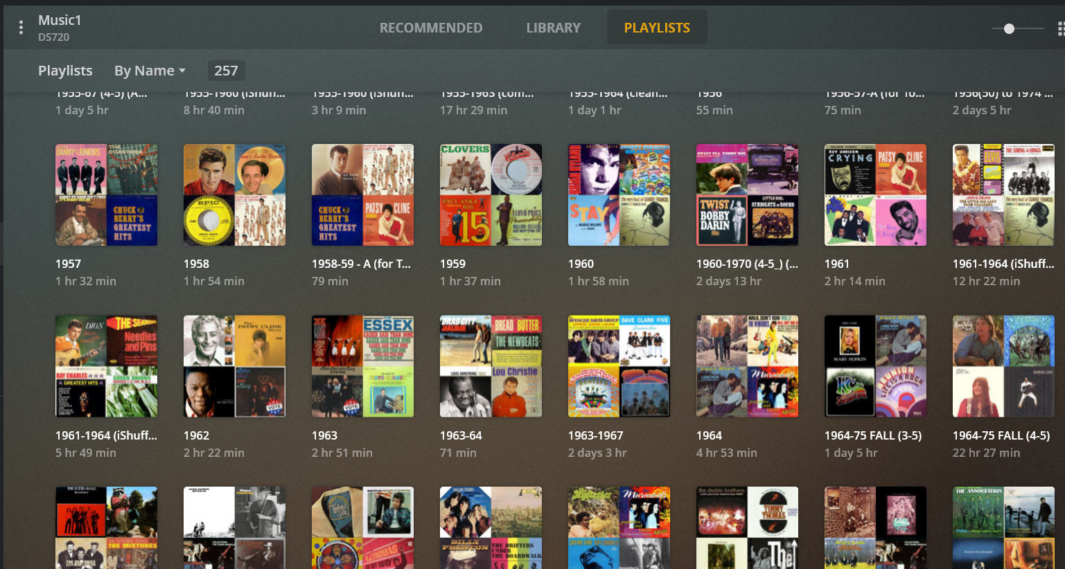 Not sure this matters but when I click the Y MUSIC-PLEX library and look at the Playlists tab, it will show two playlists. When I click the Volume1 "Music1" library and look at the playlists tab, it only shows the one I created. When I click the DS720 Playlists (DS720), it contains FIVE playlists. Don't recall why, but I deleted the two that show up additional to the 2 and 1 from each respective library.