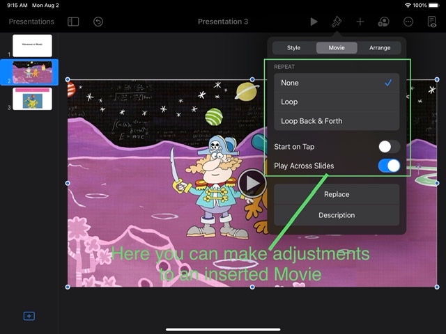 I also found that I could take a file created in Garageband and export it in native Apple format that can also be “inserted” in a slide and if you wanted played across several slides to enable say a music intro.