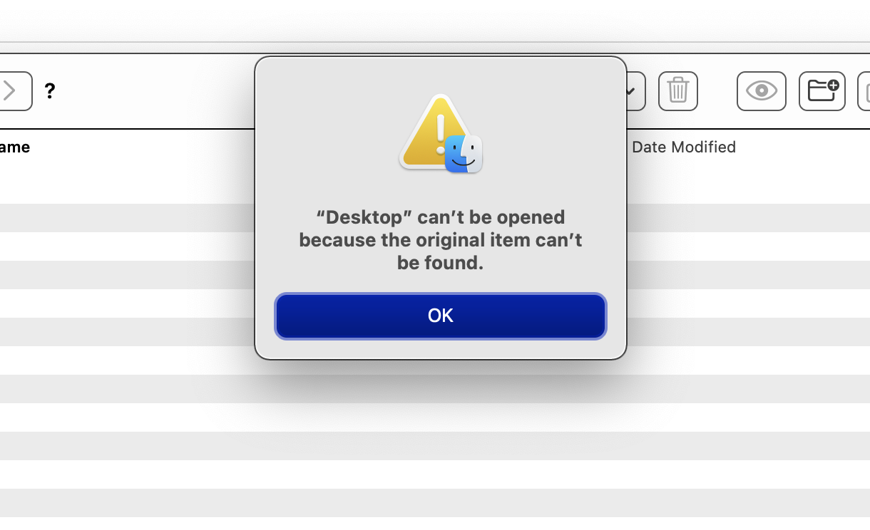 I used Migration Assistant to configure my new MacBook Air from my old MacBook Pro. In Finder, when I try to access the location "Desktop" I get a message saying I can't access it because it can't be found. Any quick way to resolve this so I can use Desktop as a normal location for info?